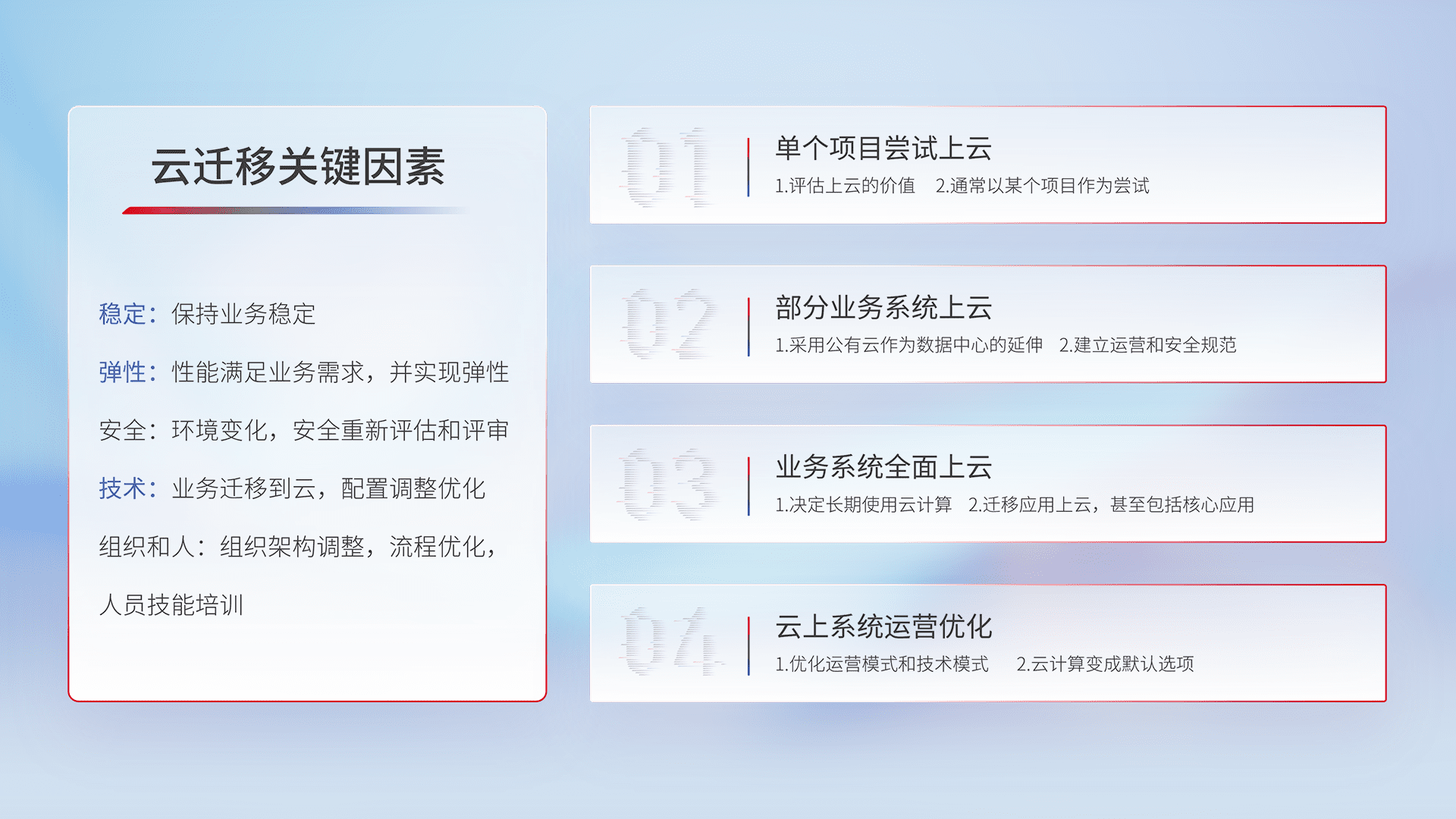 结合实际业务,,,,从规划设计、、、、云平台选型、、、云原生改造、、、数据迁移、、集成交付,,,迁移全过程为客户识别最佳上云路径,,,,做好风险识别管理,,,设计网络架构、、、、身份权限、、安全审计合规、、、操作审计、、、日志审计、、、、监控告警策略、、、、多站点容灾设计等,,,,对云上基础设施进行整体规划,,,,提升IT治理水平,,,,以满足弹性、、、高可用、、、、高性能的需求。。