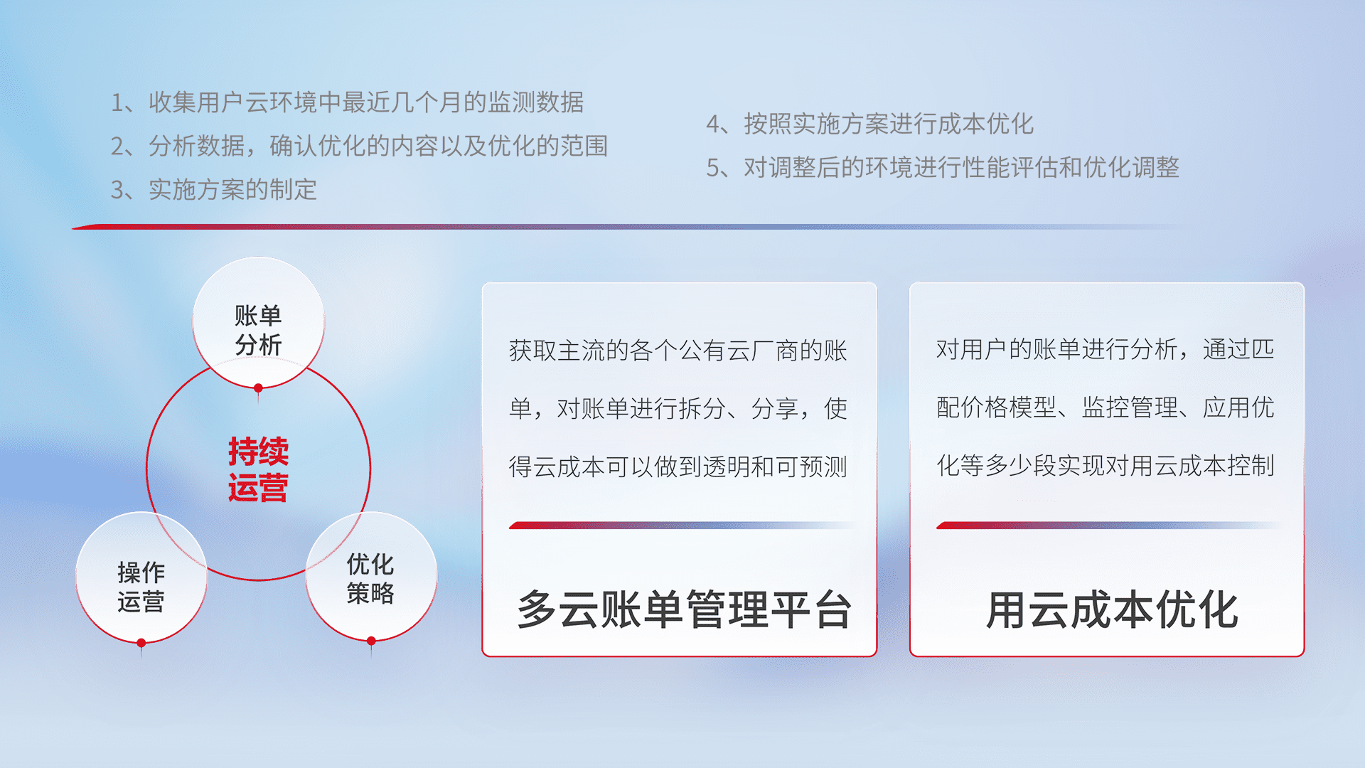 通过多云纳管,,以统一的资源数据模型把客户的云资源进行抽象和封装,,,进而实现对多云资源的统一操作,,,保障云资源管理的可靠性、、、、稳定性与可用性。。。。量身定制化运维内容,,,,配置、、、开发运维、、补丁管理、、、备份、、监控、、、认证和访问管理、、、、审计和日常巡检等,,,保障在用云过程中的可靠度,,,稳定度以及高可用率。。